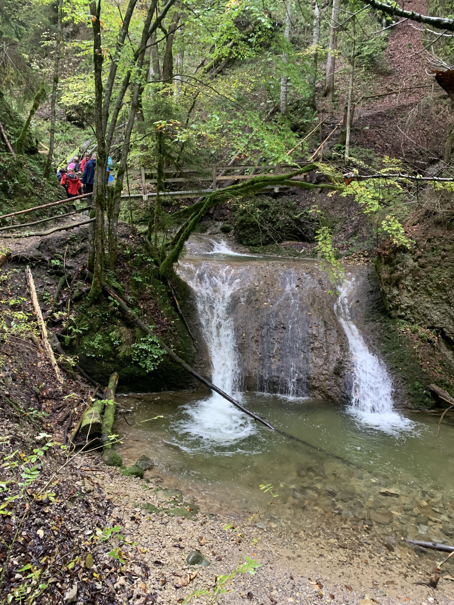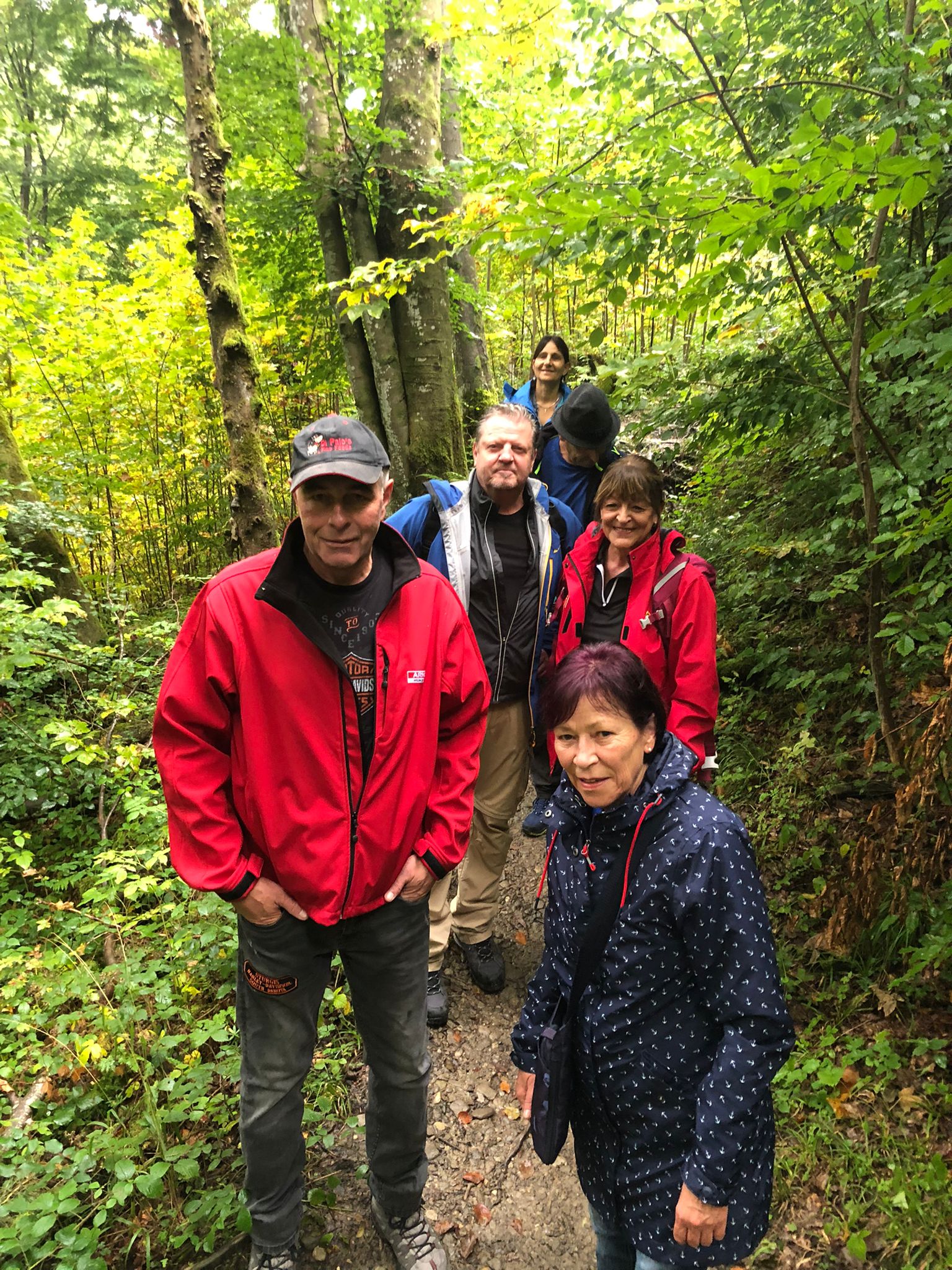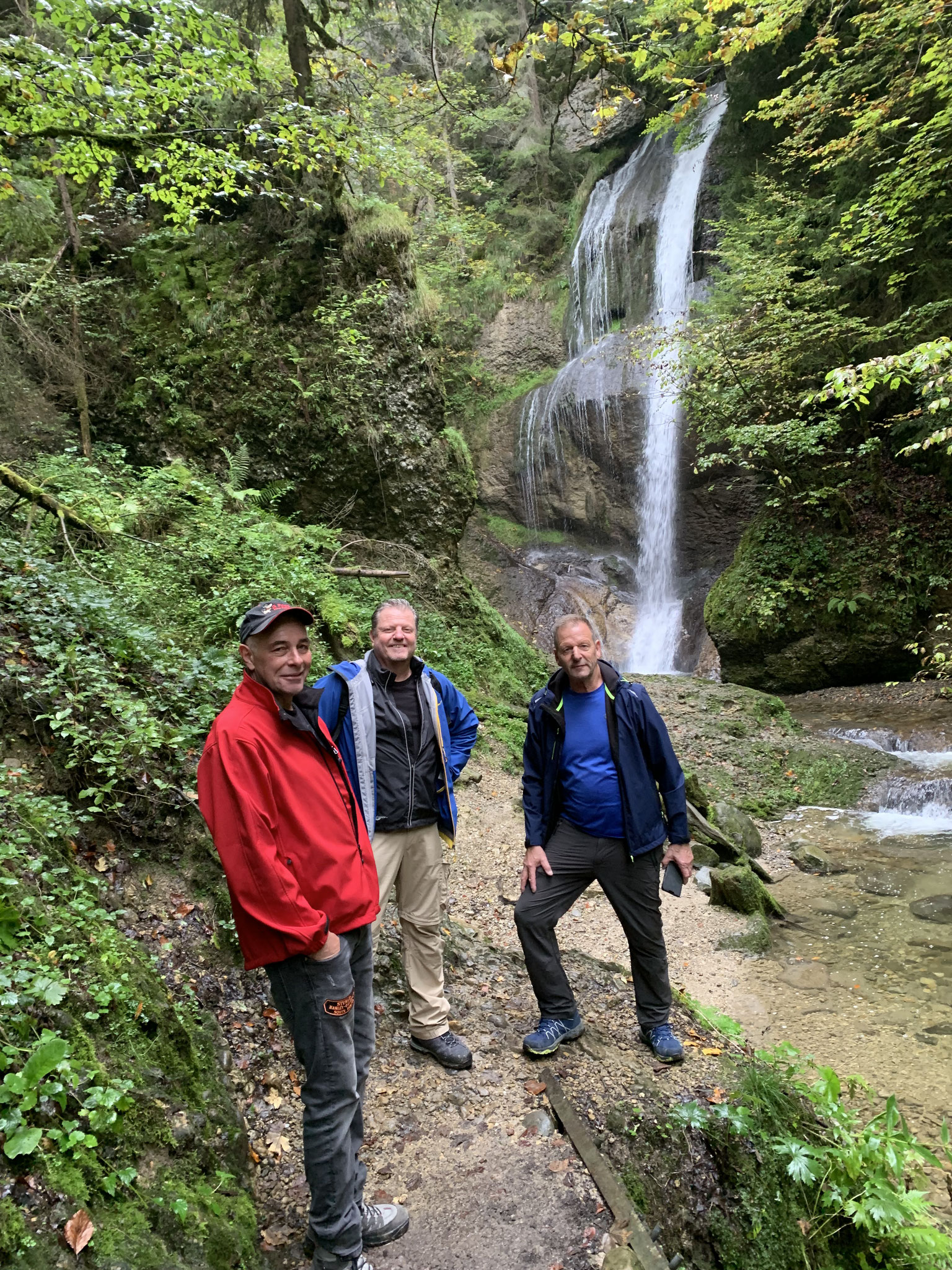 Gegen 10 Uhr traf man sich nach einem leckeren Frühstück auf der Terrasse. Ein „kleineres“ Team machte sich auf zur Destillerie Prinz und der Großteil der Mannschaft wanderte zum Wasserfall – festes Schuhwerk wurde empfohlen. Es war jedoch alles andere als ein einfacher Weg. Steil hinauf mit vielen Unwägbarkeiten und tollen Eindrücken erreichten wir nach ca. 1h den Wasserfall. Wer dann dachte wir wären am Ziel hatte sich getäuscht. Der steile Anstieg ging weiter, bis wir dann an einer Ruhebank mit „weitem“ Blick auf einen Bauernhof die erste Pause einlegten.