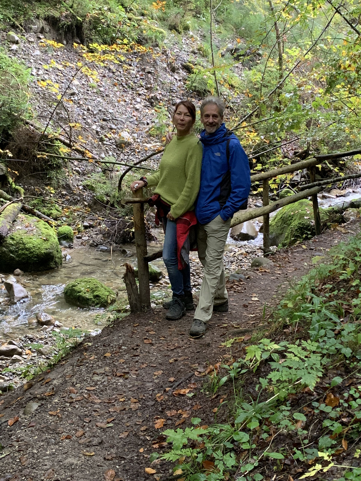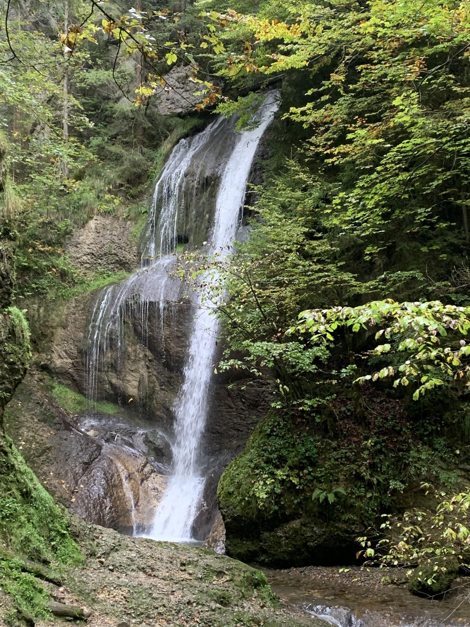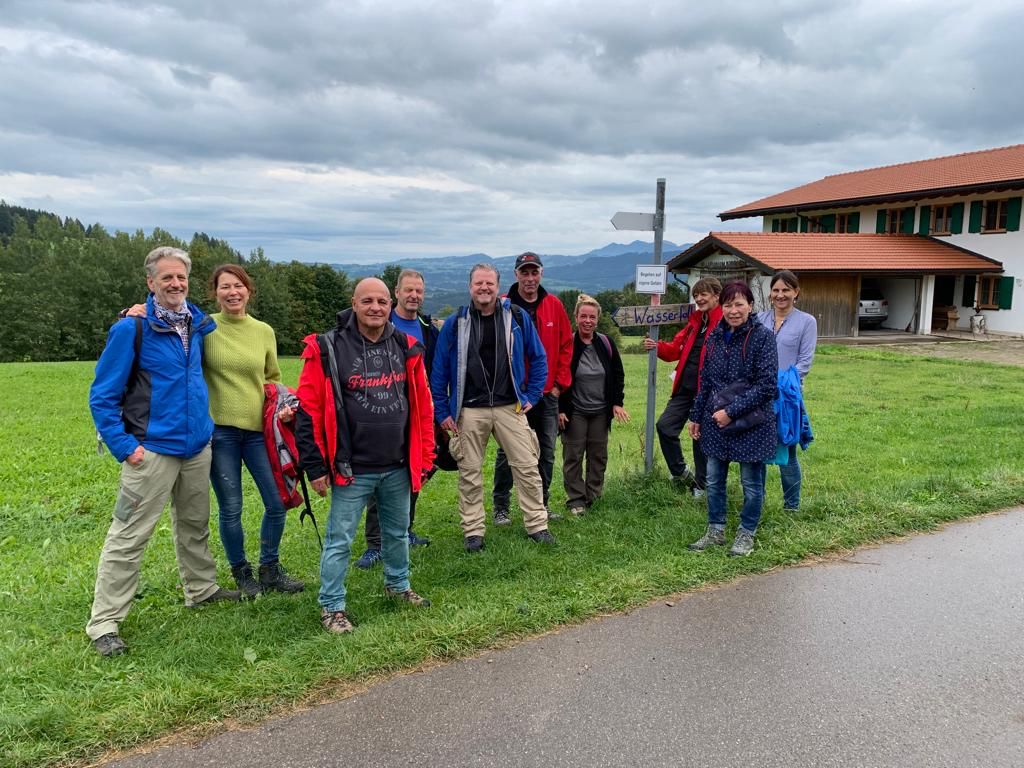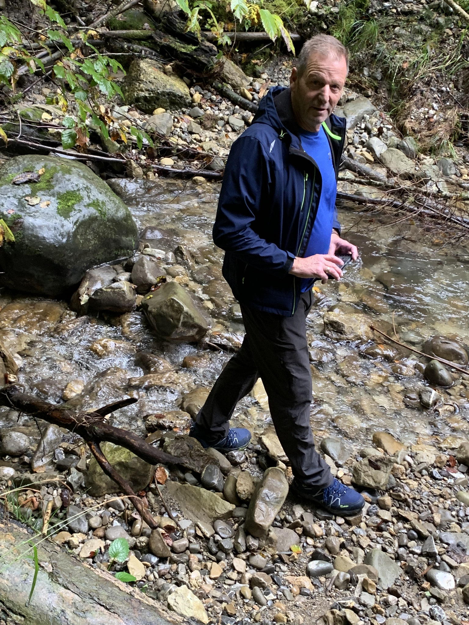 Gegen 10 Uhr traf man sich nach einem leckeren Frühstück auf der Terrasse. Ein „kleineres“ Team machte sich auf zur Destillerie Prinz und der Großteil der Mannschaft wanderte zum Wasserfall – festes Schuhwerk wurde empfohlen. Es war jedoch alles andere als ein einfacher Weg. Steil hinauf mit vielen Unwägbarkeiten und tollen Eindrücken erreichten wir nach ca. 1h den Wasserfall. Wer dann dachte wir wären am Ziel hatte sich getäuscht. Der steile Anstieg ging weiter, bis wir dann an einer Ruhebank mit „weitem“ Blick auf einen Bauernhof die erste Pause einlegten.