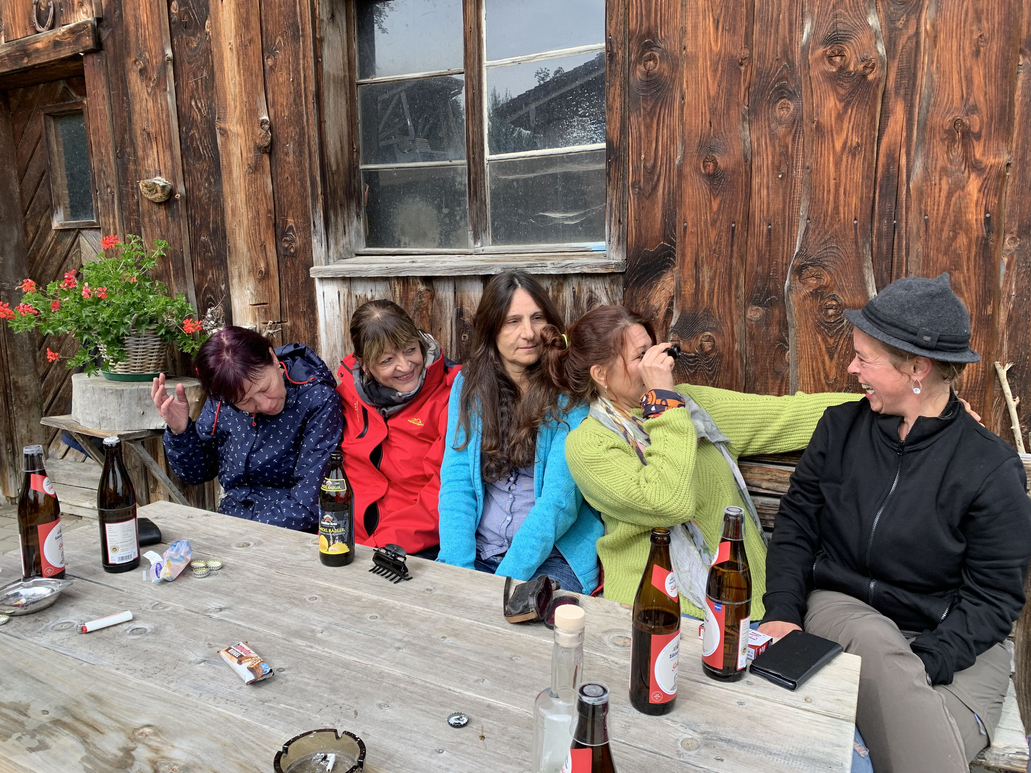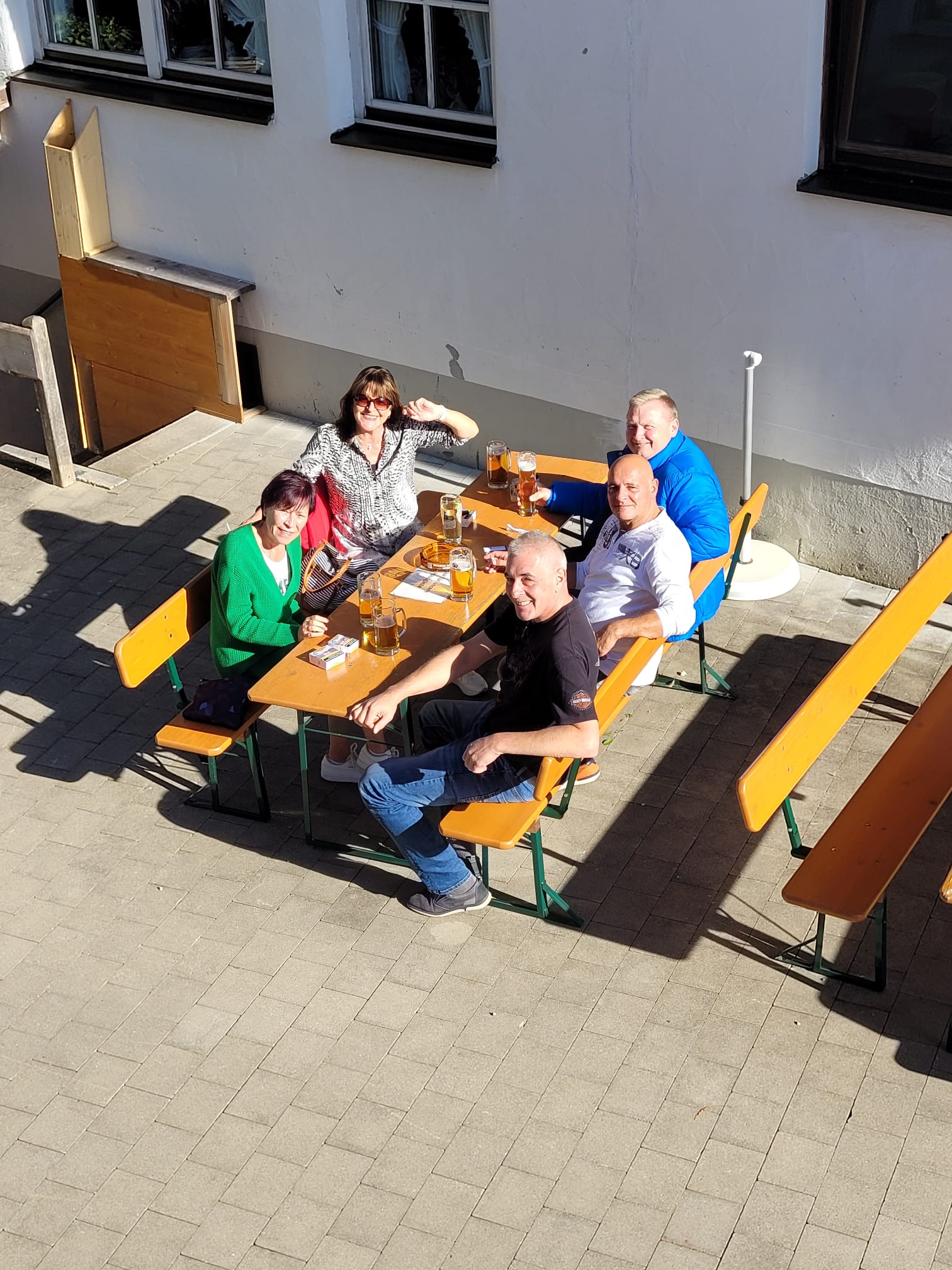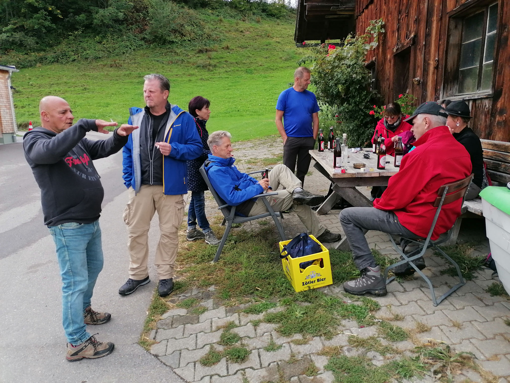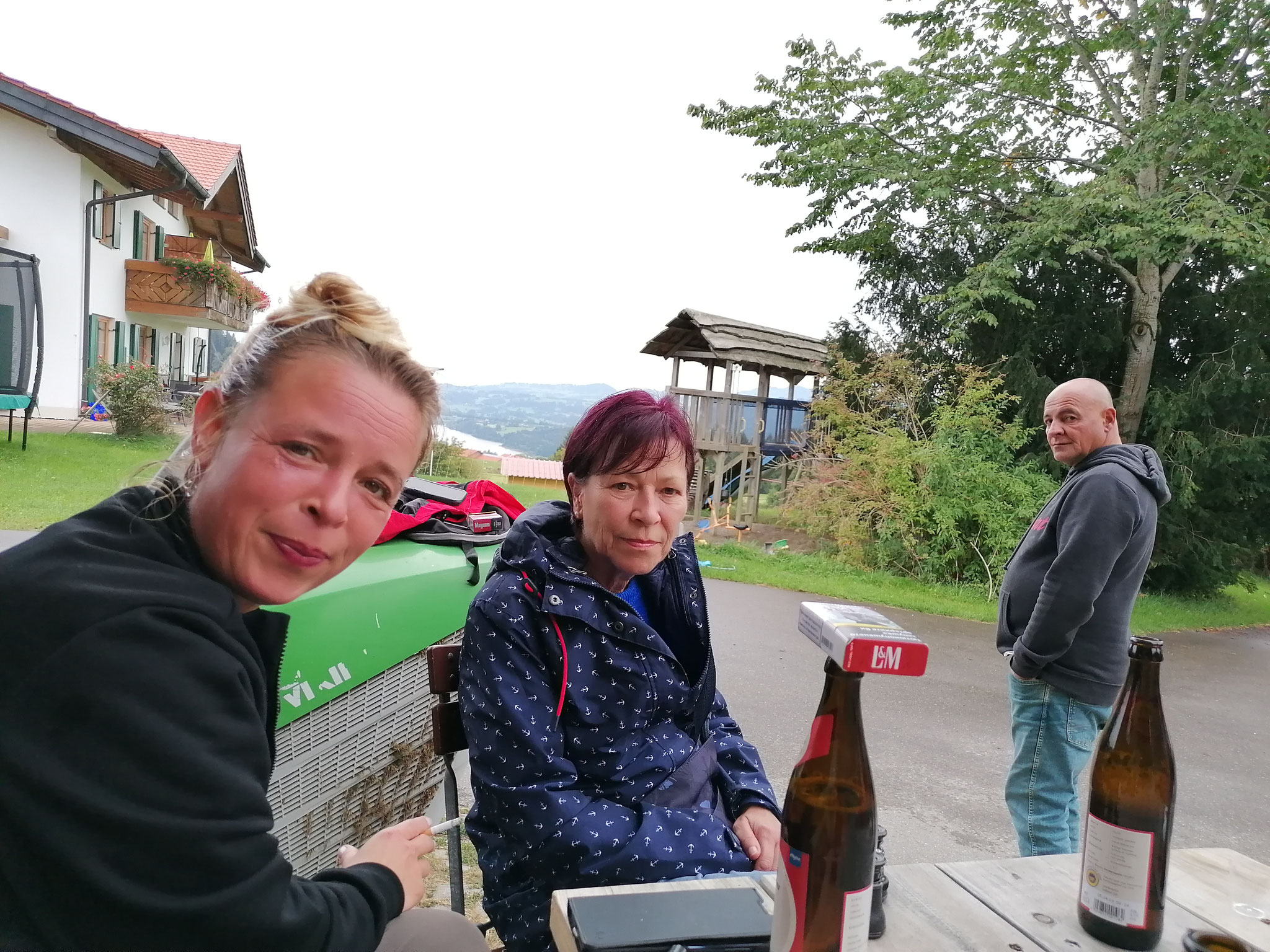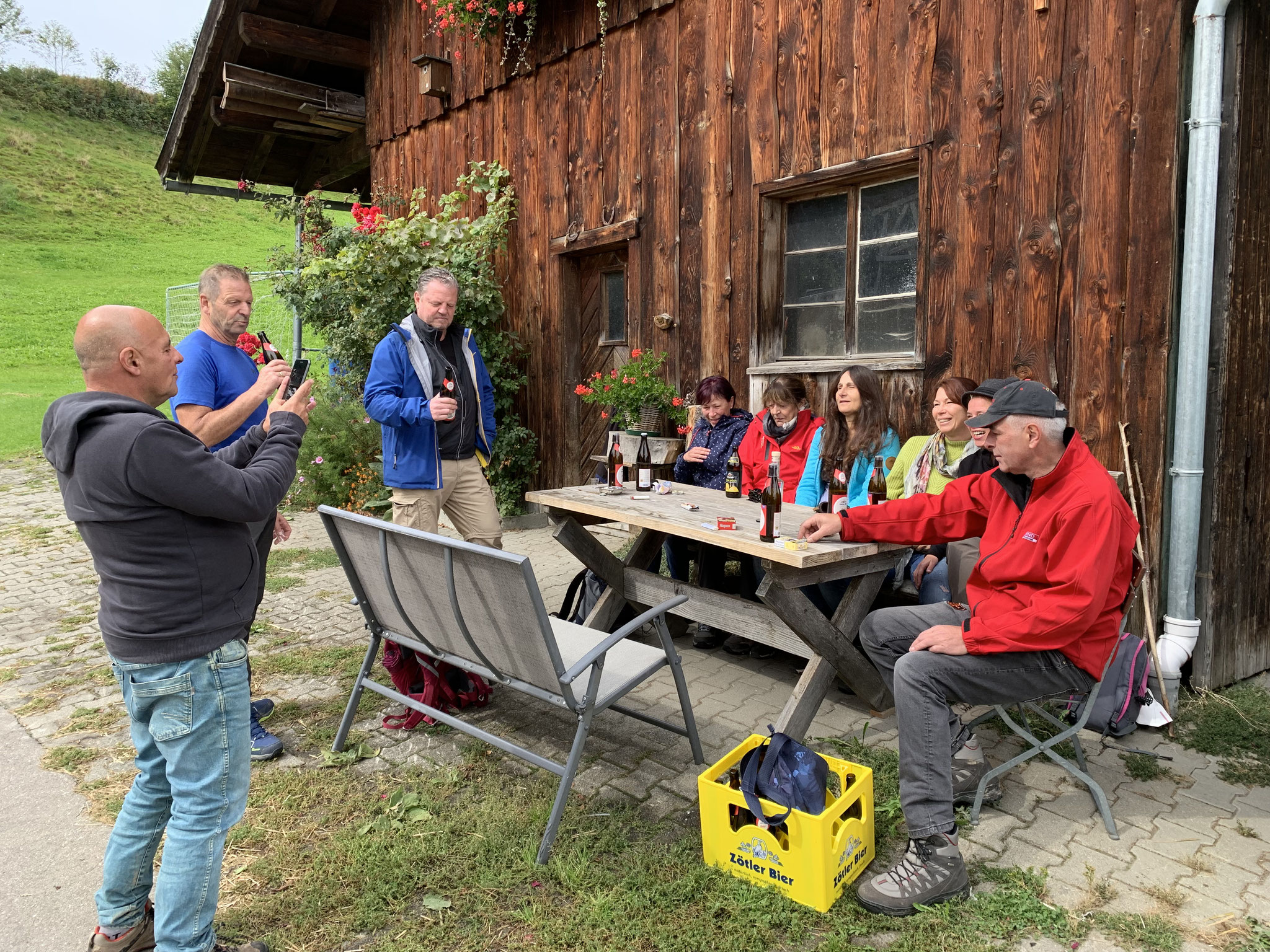 Ein Mobilmacher wäre jetzt nicht schlecht! Unser Präsi hatte vorsorglich einen leckeren selbstgebrannten Quittenschnaps 2020 mitgenommen. Das tat gut, der Durst jedoch nicht gelöscht. Der letzte Anstieg zum Bauernhof wurde dann doch etwas lockerer genommen. Völlig unerwartet haben wir festgestellt, dass dort auch Getränke verkauft wurden. Als dann noch eine Biertischgarnitur windgeschützt in der Sonne mit herrlichem Blick auf den See und Gründen war der Tag gerettet. Der Durst war gestillt.